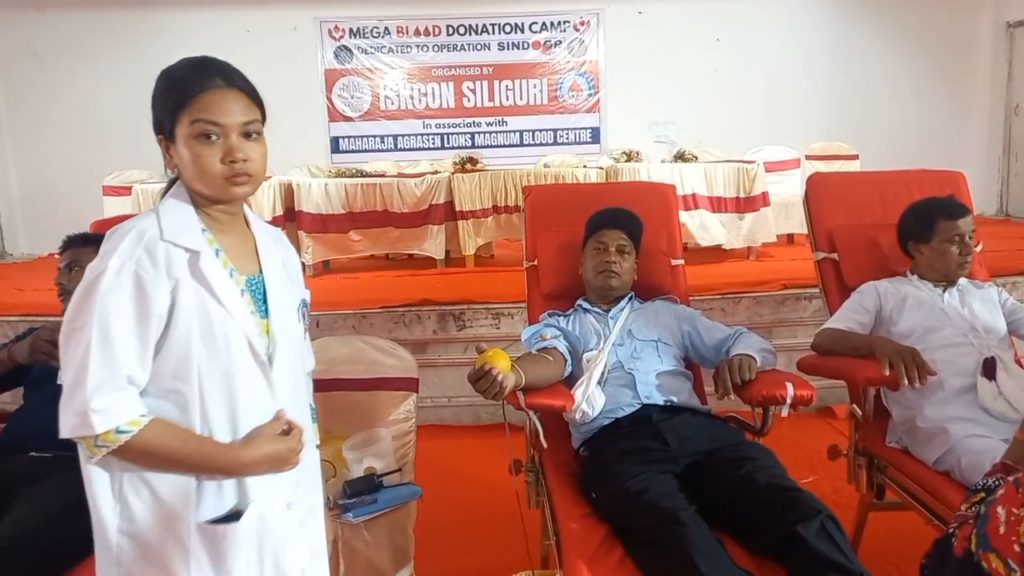 ভারতীয় সেনাবাহিনীর গৌরবময় অভিযান “অপারেশন সিদুর”-কে উৎসর্গ করে আজ শিলিগুড়ি ইস্কন মন্দিরে অনুষ্ঠিত হলো এক মেগা রক্তদান শিবির। ইস্কন মন্দির চত্বরে আয়োজিত এই শিবিরে সকাল থেকেই শুরু হয় রক্তদান, যেখানে প্রথমেই অংশগ্রহণ করেন মন্দিরের সাধু ও সন্ন্যাসীরা।