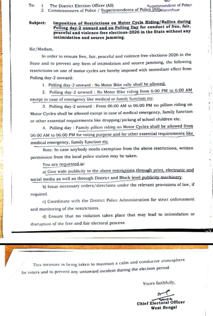 রাজ্যজুড়ে বিধানসভা নির্বাচন অবাধ, সুষ্ঠু এবং শান্তিপূর্ণভাবে পরিচালনার লক্ষ্যে একাধিক পদক্ষেপ করেছে কমিশন । এবারে মোটরবাইক চলাচল নিয়ন্ত্রণ করা হবে বলে নির্দেশিকা জারি করল প্রশাসন ।