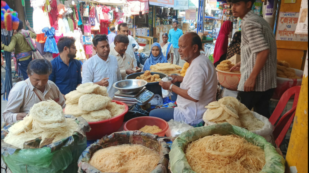 সামনেই খুশির পবিত্র ঈদ। আর সেই পবিত্র ঈদ উপলক্ষে শনিবার বিকেল তিনটে নাগাদ মালদা জেলার গাজোল বাজারে ভিড় উপচে পড়ে।মানুষরা উৎসাহের সঙ্গে বাজারে মেতে উঠেছেন। ঈদ উপলক্ষে কেউ নতুন শাড়ি,জামা কেনাকাটি করেন ।কেউ বা নতুন গেঞ্জি এবং লুঙ্গি কিনৈন। এর পাশাপাশি দেখা গিয়েছে বাজারের সেমাই এর দোকানে ব্যাপক ভিড় ছিল। গাজোল ইউ বি আই রোড এলাকায় এক দোকানে একাধিক সেমায়ের আইটেমের সেমাই বিক্রি হয়।