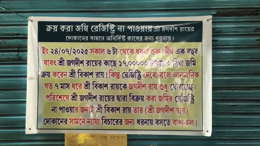জমি রেজিস্ট্রির দাবিতে ৫ দিন ধরে এক যুবকের ধরনা যেন মনে করিয়ে দেয় ‘দামিনী’ সিনেমার সেই দৃশ্য—”তারে হ্যায়!” যেখানে এক নিরীহের ন্যায়ের লড়াই গোটা ব্যবস্থাকে নাড়িয়ে দিয়েছিল। এবার বাস্তবে এমন এক ঘটনা ঘটেছে ময়নাগুড়ি ব্লকের পানবাড়িতে। নিজের কষ্টের টাকা দিয়ে জমি কিনে সেই জমি ৭ মাস ধরে রেজিষ্টি না পেয়ে গত বৃহস্পতিবার ময়নাগুড়ি ব্লকের পানবাড়ি বাজার সংলগ্ন এলাকার বিকাশ রায়, জগদীশ রায়ের দোকানে তালা মেরে দোকানের সামনে অনির্দিষ্টকালের জন্য ধর্নায় বসেছিলেন, আর সেই ধর্না পৌঁছালো ৫দিনে। এখনও পর্যন্ত কোন সুরাহা মেলেনি। অসুস্থ শরীর নিয়ে টানা ৫ দিন ধরে নিজের কষ্টের টাকায় কেনা জমি রেজিস্ট্রির দাবিতে ধর্নারত I নিজের অসুস্থ শরীর যদি কোনরকম অঘটন ঘটে তার সম্পূর্ণ দায় জগদীশ রায়কে নিতে হবে বলে সংবাদ মাধ্যমের সামনে বলেন।