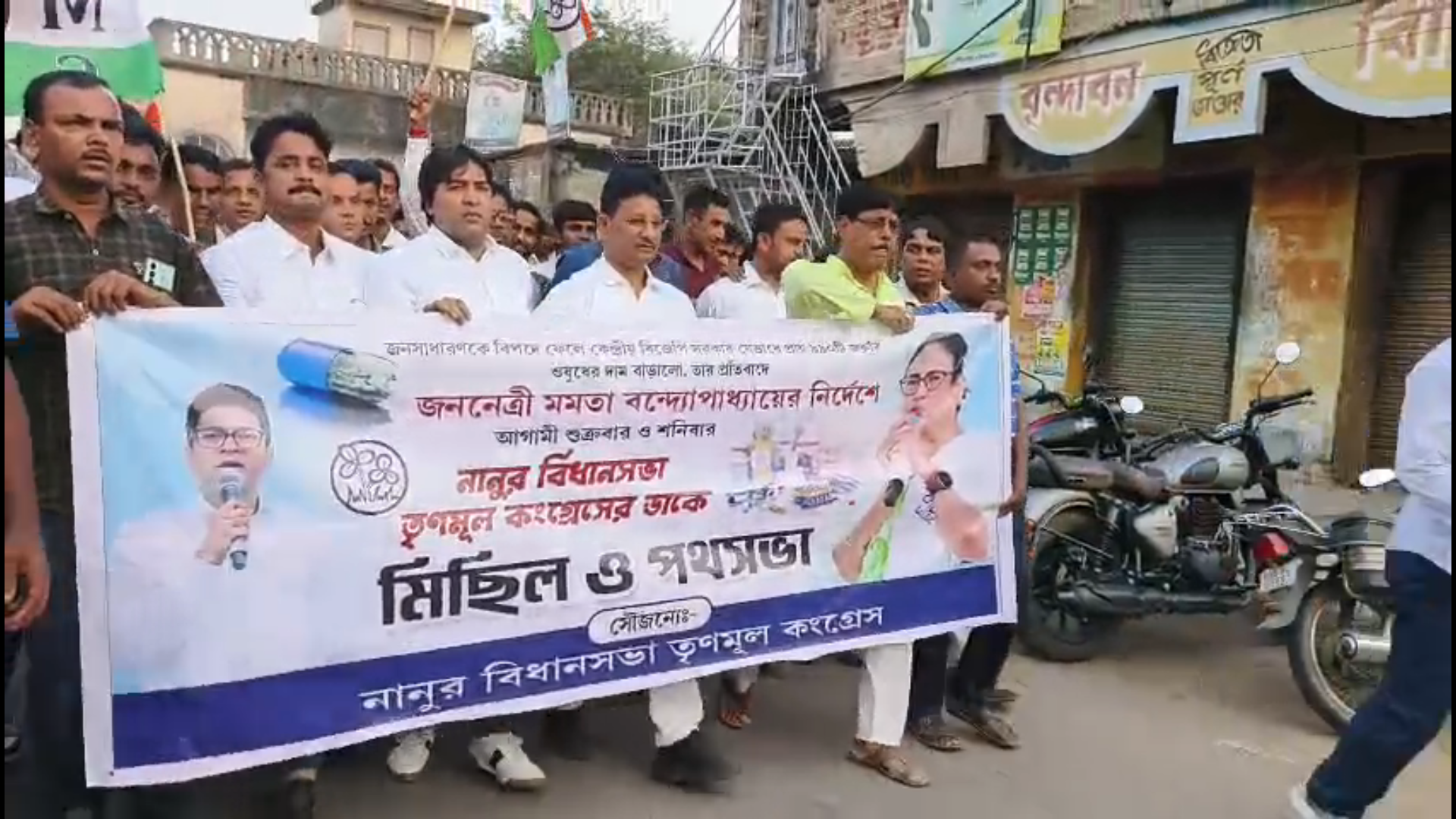মাননীয়া মুখ্যমন্ত্রী মমতা বন্দ্যোপাধ্যায় নির্দেশে বীরভূম জেলায় নানুর বিধানসভার অন্তর্গত নানুরে তৃণমূল কংগ্রেসের ডাকে কেন্দ্রীয় সরকারের জনবিরোধী নীতি, জীবন দায়ী ঔষধ সহ প্রয়োজনীয় দ্রব্য সামগ্রী দ্রব্যমূল্য বৃদ্ধির প্রতিবাদে আজকে নানুর বাসস্ট্যান্ডে বিক্ষোভ মিছিল এবং পথসভার আয়োজন করা হয়েছিল।