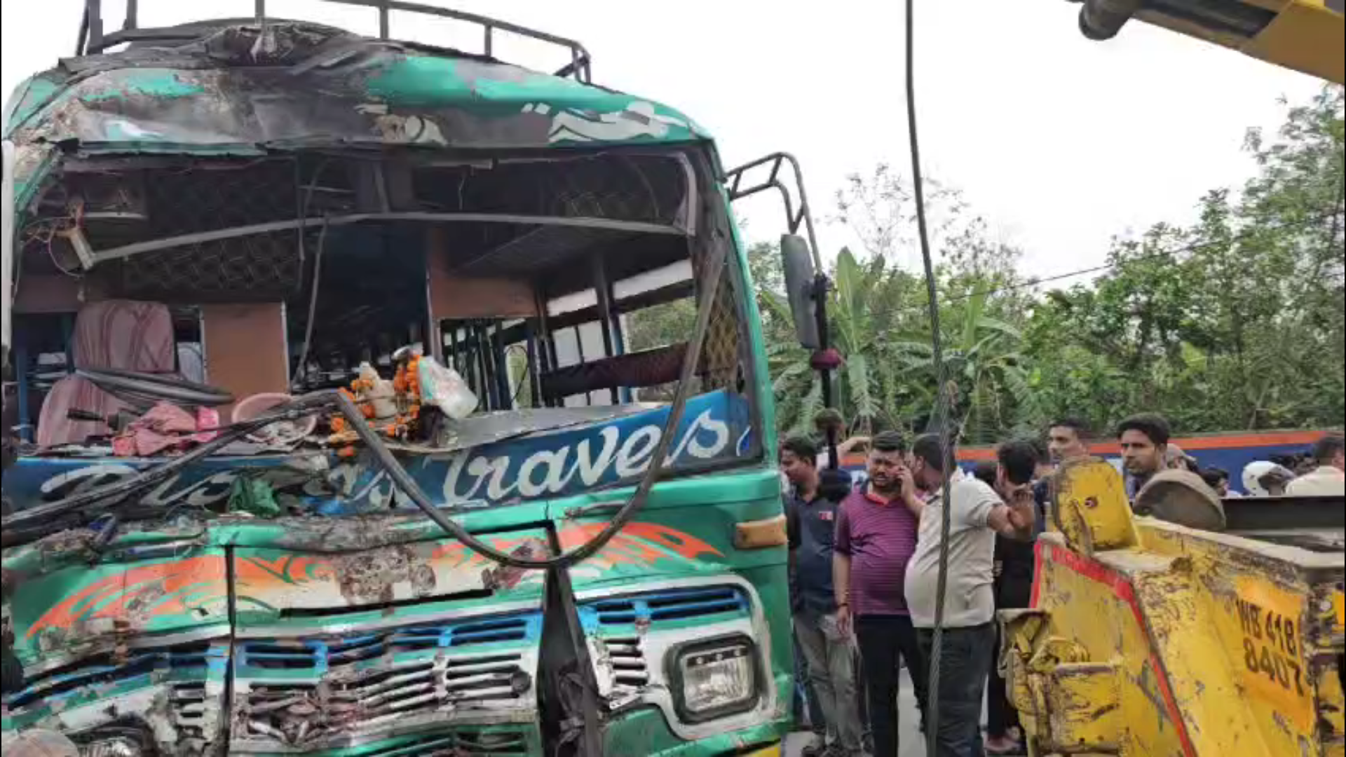 একটা গুসকরা রূটের বাস ওপর বাসটি ইলামবাজার রুটের বাস। দ্রুতগতিতে যাবার সময় দুটি বাসে মুখোমুখি সংঘর্ষ হয়।