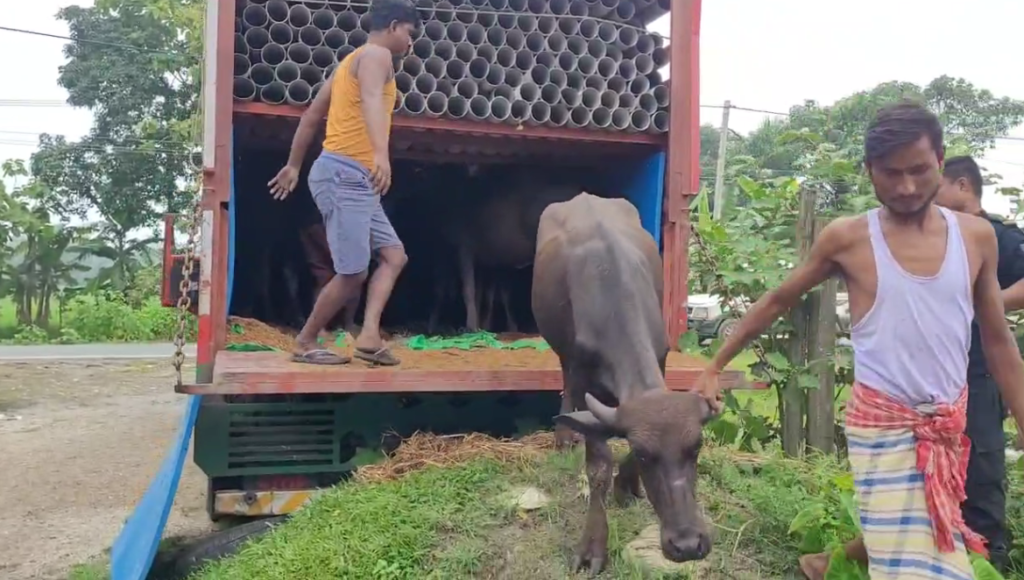 অসমে পাচারের আগে অভিযান চালিয়ে কন্টেনার বোঝাই ৩০টি মোষ উদ্ধার করল বক্সিরহাট থানার পুলিশ। মহিষ পাচারের অভিযোগে দুই ব্যক্তিকে গ্রেফতার করে পুলিশ। ধৃতদের সোমবার স্বাস্থ্য পরীক্ষা করার পর তুফানগঞ্জ মহকুমা দায়রা আদালতে পাঠায় পুলিশ। জানা যায়, রবিবার মানতানি বাজার এলাকায় পুলিশ নাকা তল্লাশির সময় আসাম নাম্বারের একটি গাড়ি আটক করে কর্তব্যরত পুলিশকর্মীরা I সেই সময় গাড়ির ভিতরে কর্তব্যরত পুলিশ কর্মীরা তল্লাশি চালাতে চাইলে চালকের কথায় অসংগতি মেলায় সন্দেহ হয় পুলিশের। এরপরই পুলিশ তল্লাশি চালিয়ে পাইপ ভর্তি লরির গোপন চেম্বার থেকে ৩০ টি মহিষ উদ্ধার করে।