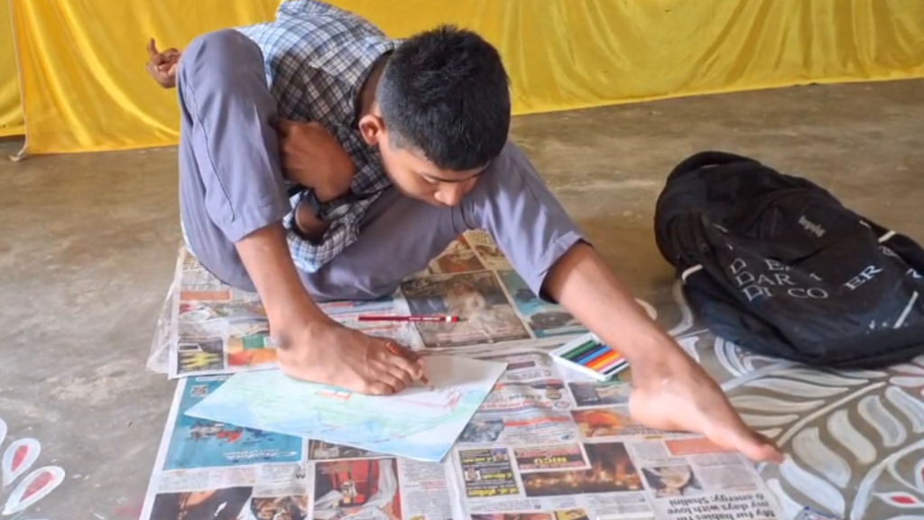 হর ঘর তিরঙ্গা কর্মসূচিকে কেন্দ্র করে বিদ্যালয়ে আয়োজন করা হয় বসে আঁকো প্রতিযোগিতার। আর তাতে নিজ পায়ে ছবি এঁকে সবাইকে অবাক করে দিল রোমিও। পায়ে পেন্সিল ধরে অসাধারণ ছবি এঁকে দিল অল্প সময়ের মধ্যেই। আগামী দিন রোমিও আরো এগিয়ে যাক এটাই চাইছে সকলে।