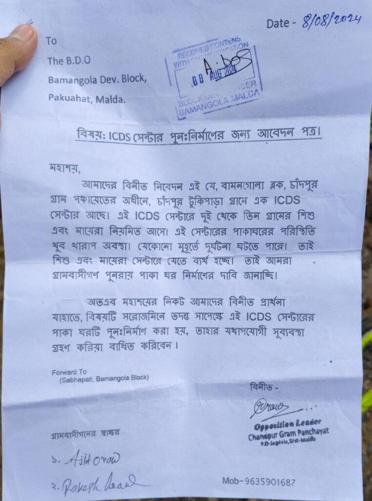 বিপদজনক অবস্থা অঙ্গনওয়াড়ি কেন্দ্রের। খসে পড়ছে চাঙ্গর। যে কোনো সময় বেহাল এই ভবন ভেঙে ঘটতে পারে বড় দুর্ঘটনা। বড়সড় বিপদের মুখে পড়তে পারে শিশু এবং প্রসূতিরা। তারপরেও হুঁশ নেই প্রশাসনের। এই সেন্টার স্থানান্তরের দাবিতে স্থানীয়দের বিক্ষোভ এবং গণ ডেপুটেশন। মঙ্গলবার মালদার বামনগোলার চাঁদপুর এলাকার এই ঘটনায় চাঞ্চল্য ছড়িয়েছে। প্রশাসনের ভূমিকা নিয়ে শুরু হয়েছে রাজনৈতিক তরজা। বেহাল দশার কথা মেনে নিচ্ছে প্রশাসন। চাঁদপুরের টুকিপাড়া গ্রামে একটি অঙ্গনওয়াড়ি কেন্দ্র রয়েছে। সেই কেন্দ্রের পাকা ঘর থাকলেও সেই ঘরের বেহাল দশা। দীর্ঘদিন ধরে হয়নি সংস্কার।