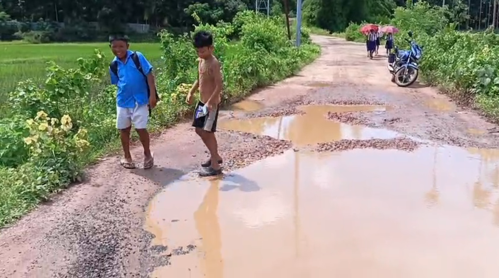রাস্তার মাঝখানে বড় বড় গর্ত হয়ে জল জমে থাকায় জুতো হাতে বিদ্যালয় মুখী ছাত্র-ছাত্রীরা। ত্রিপুরা সিপাহীজলা জেলা দক্ষিণ চড়িলাম থেকে রামনগর পর্যন্ত রাস্তার মাঝখানে গর্ত হয়ে জল জমে বেহাল দশায় পরিণত হয়ে রয়েছে।