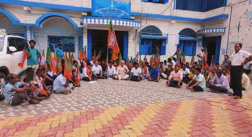 এন কে এস গ্রাম পঞ্চায়েতের ভুয়ো বিল কাণ্ডে তদন্তের অগ্রগতির দাবি সহ মোট সাত দফা দাবি নিয়ে কুমারগ্রামের বিডিওকে ডেপুটেশন দিল ভারতীয় জনতা পার্টী। শুক্রবার দুপুরে পাগলাহাট থেকে মিছিল করে বিডিও অফিসে পৌচ্ছায় বিজেপির নেতা কর্মীরা। বিডিও অফিসের প্রবেশ দ্বারে বসে মাইকে স্লোগান তুলে বিক্ষোভ দেখায় তারা। কুমারগ্রাম থানার পুলিশ মাইক বন্ধ করতে গেলে পরিস্থিতি বেগতিক হয়। পুলিশকে ঘিরে বিক্ষোভ দেখায় বিজেপি কর্মীরা।