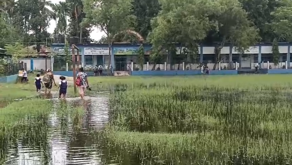 জলপাইগুড়ি বালা পাড়ায় জলমগ্ন মাঠে স্কুল যাতায়াত দুর্ভোগ, দাবি পূরণ না হওয়ায় স্কুলের গ্যাটে অবিভাবকরা তালা ঝুলিয়ে দিল। তৃণমূল নেতার হস্তক্ষেপে ধুন্ধুমার পরিস্থিতি স্কুল চত্বরে। জলপাইগুড়ি সদর ব্লকের বালা পাড়া বিবেকানন্দ পল্লীর ধর্মদেব হাইস্কুল ও তিস্তাচর এসপি প্রাথমিক বিদ্যালয়ের মাঠ বর্ষায় হাঁটু সমান জলে ডুবে থাকায় পড়ুয়া ও শিক্ষকদের যাতায়াতে নিত্য দিন চরম দুর্ভোগ চলছে। সাত দিন আগে স্কুল কর্তৃপক্ষকে প্রশাসন আশ্বাস দিয়েছিল—তিন দিনের মধ্যে মাঠের এক পাশ দিয়ে পাথর-বালি ফেলে উচু করে হাঁটার রাস্তা তৈরি করা হবে। কিন্তু সেই প্রতিশ্রুতি পূরণ না হওয়ায় বুধবার সকালে ক্ষুব্ধ অভিভাবকরা স্কুলের গ্যাটে তালা ঝুলিয়ে দেন।