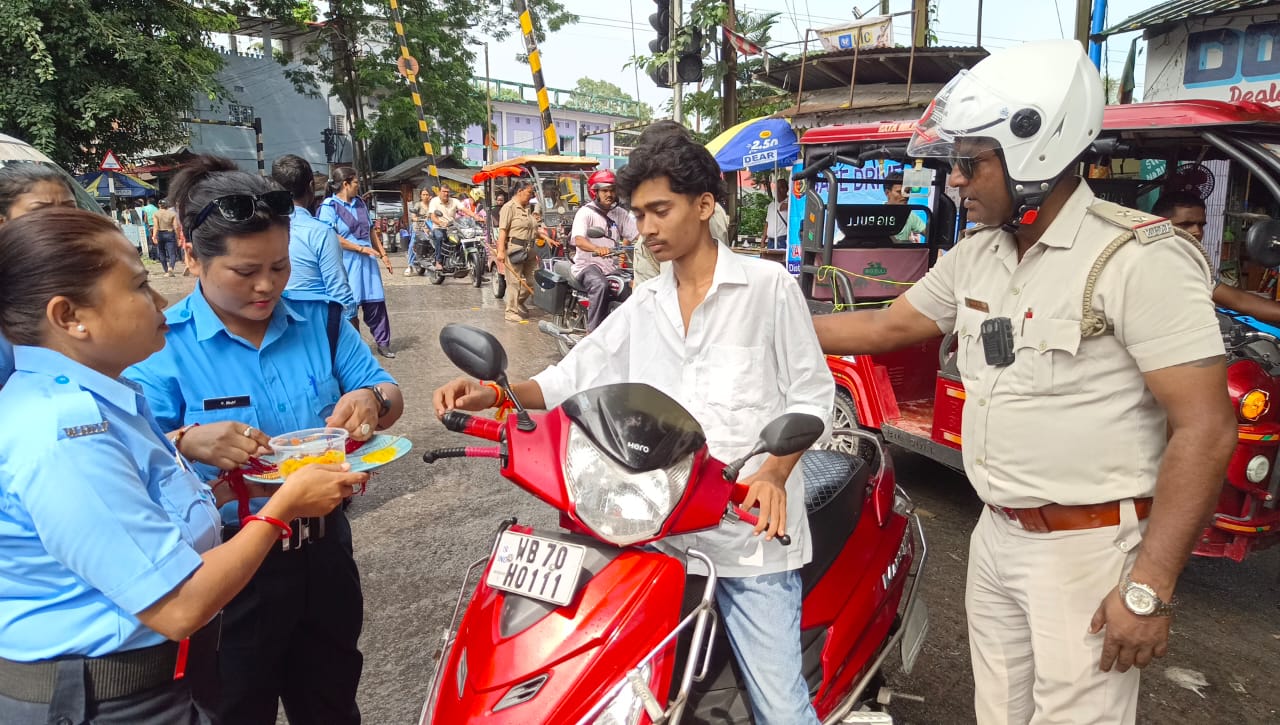 ট্রাফিক নিয়ম উল্লঙ্ঘনকারীদের রাখি পরিয়ে মিষ্টিমুখ করাল পুলিশ। শনিবার অভিনব কায়দায় রাখি বন্ধন উৎসব পালন করলেন কালচিনি ট্রাফিক পুলিশের আধিকারিক ও কর্মীরা। এদিন কালচিনি চৌপথি এলাকায় ট্রাফিক পুলিশের তরফে হেলমেট বিহীন বাইক আরোহীদের দার করিয়ে রাখি পড়ানো হয়,পাশাপাশি মিষ্টিমুখও করানো হয়।
